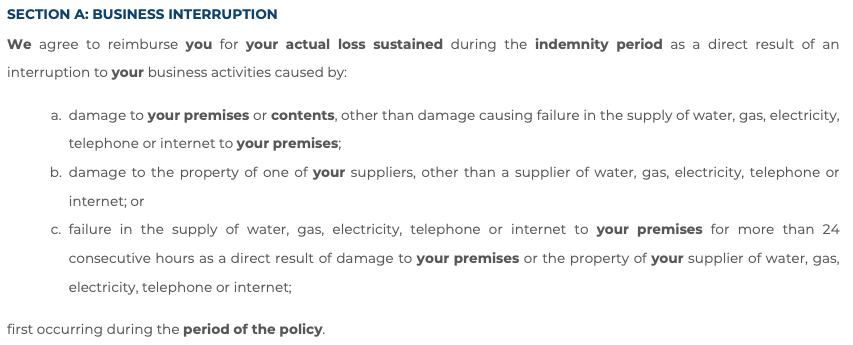 An important thing to note is that this insurer’s wording, like many others, ties the business interruption coverage specifically to damage to a business’ property, premises, contents or those of its suppliers. So the definition of business interruption risk provided by this insurer relates to physical type risks only, as opposed to cyber or financial type risks.